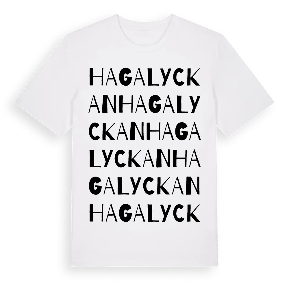 Hagalyckan ordlek t-shirt är inspirerad av Hagalyckan i Hallands län, Sverige. Tröjan är designad för dig som har en speciell koppling till platsen – oavsett om du bor här, har rötterna här eller bara älskar Hagalyckan.