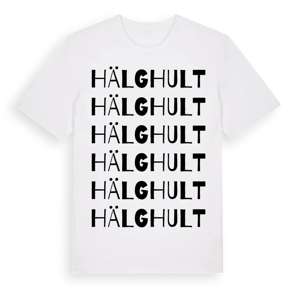 Hälghult ordlek t-shirt är inspirerad av Hälghult i Hallands län, Sverige. Tröjan är designad för dig som har en speciell koppling till platsen – oavsett om du bor här, har rötterna här eller bara älskar Hälghult.