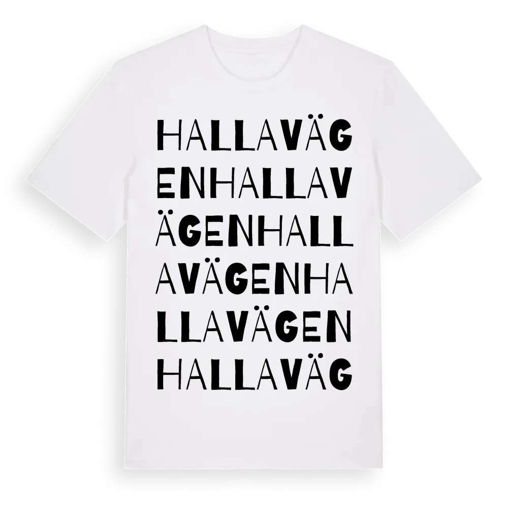 Hallavägen ordlek t-shirt är inspirerad av Hallavägen i Hallands län, Sverige. Tröjan är designad för dig som har en speciell koppling till platsen – oavsett om du bor här, har rötterna här eller bara älskar Hallavägen.