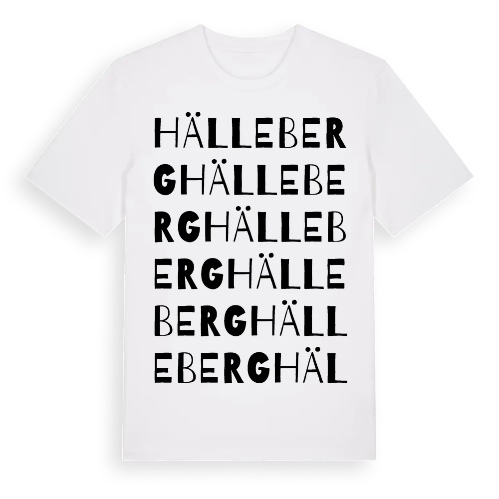 Hälleberg ordlek t-shirt är inspirerad av Hälleberg i Hallands län, Sverige. Tröjan är designad för dig som har en speciell koppling till platsen – oavsett om du bor här, har rötterna här eller bara älskar Hälleberg.