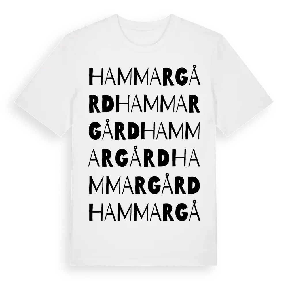 Hammargård ordlek t-shirt är inspirerad av Hammargård i Hallands län, Sverige. Tröjan är designad för dig som har en speciell koppling till platsen – oavsett om du bor här, har rötterna här eller bara älskar Hammargård.