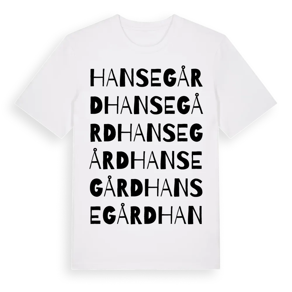 Hansegård ordlek t-shirt är inspirerad av Hansegård i Hallands län, Sverige. Tröjan är designad för dig som har en speciell koppling till platsen – oavsett om du bor här, har rötterna här eller bara älskar Hansegård.