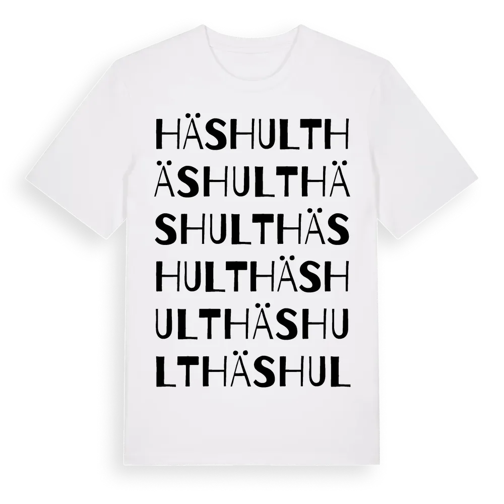 Häshult ordlek t-shirt är inspirerad av Häshult i Hallands län, Sverige. Tröjan är designad för dig som har en speciell koppling till platsen – oavsett om du bor här, har rötterna här eller bara älskar Häshult.