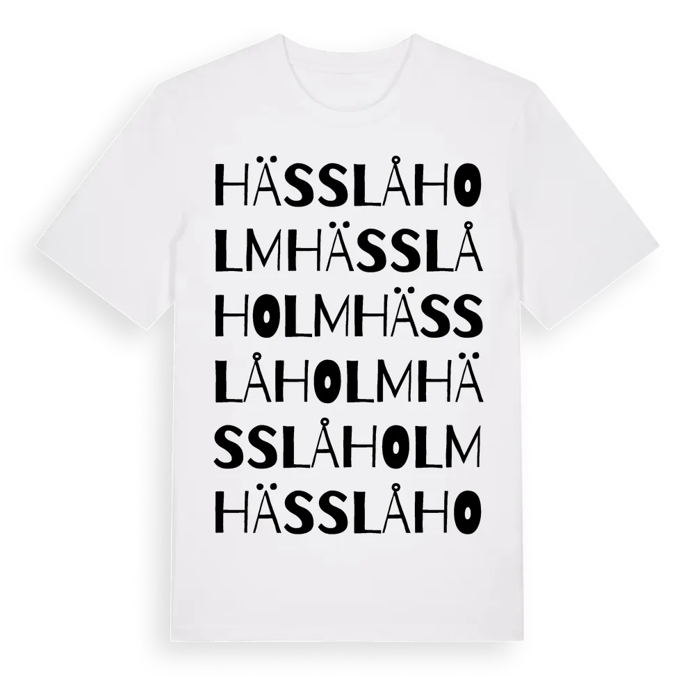 Hässlåholm ordlek t-shirt är inspirerad av Hässlåholm i Hallands län, Sverige. Tröjan är designad för dig som har en speciell koppling till platsen – oavsett om du bor här, har rötterna här eller bara älskar Hässlåholm.