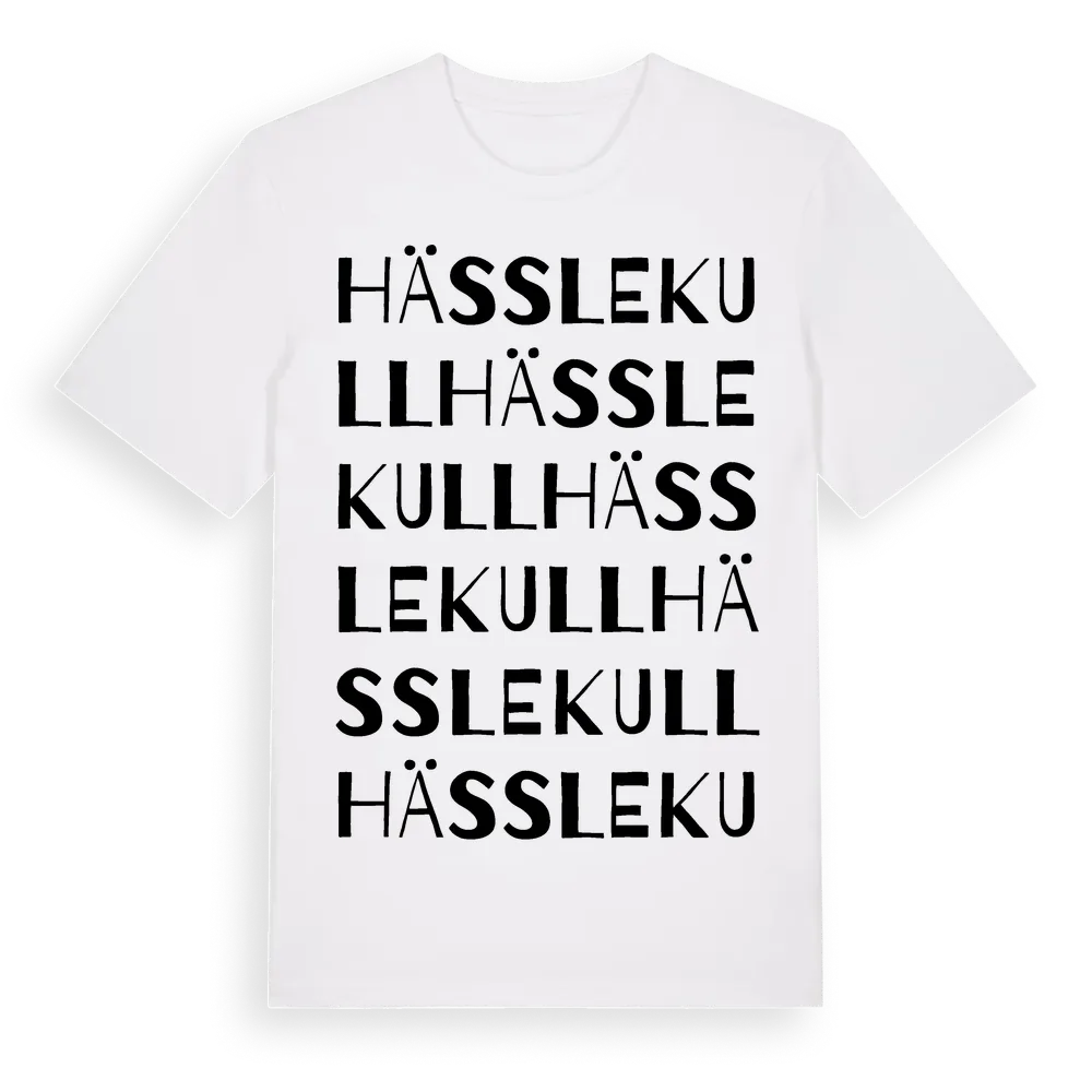 Hässlekull ordlek t-shirt är inspirerad av Hässlekull i Hallands län, Sverige. Tröjan är designad för dig som har en speciell koppling till platsen – oavsett om du bor här, har rötterna här eller bara älskar Hässlekull.