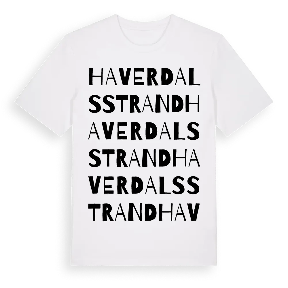 Haverdalsstrand ordlek t-shirt är inspirerad av stadsdelen Haverdalsstrand i Hallands län, Sverige. Tröjan är designad för dig som har en speciell koppling till platsen – oavsett om du bor här, har rötterna här eller bara älskar Haverdalsstrand.