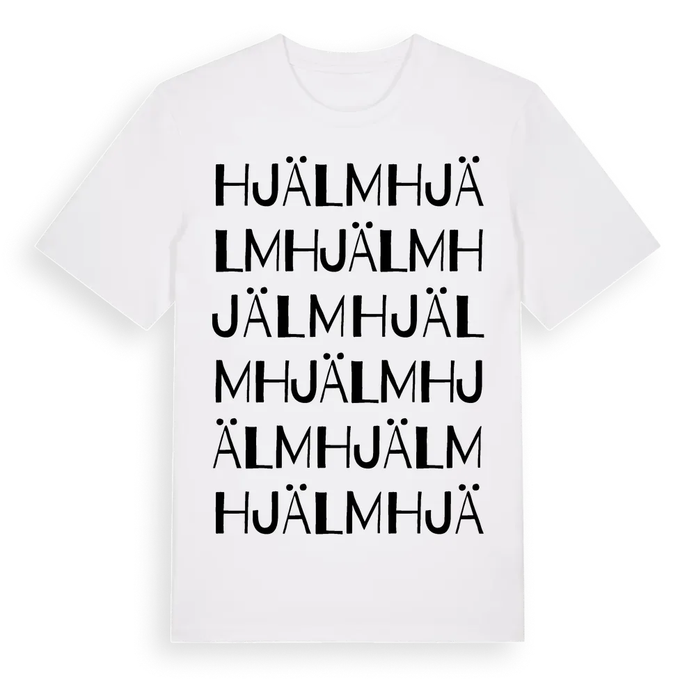 Hjälm ordlek t-shirt är inspirerad av byn Hjälm i Hallands län, Sverige. Tröjan är designad för dig som har en speciell koppling till platsen – oavsett om du bor här, har rötterna här eller bara älskar Hjälm.