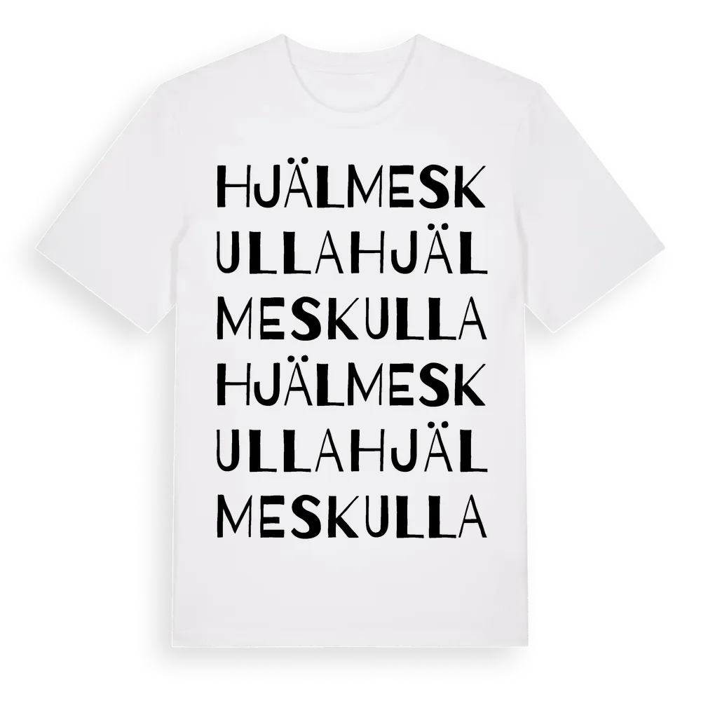 Hjälmeskulla ordlek t-shirt är inspirerad av Hjälmeskulla i Hallands län, Sverige. Tröjan är designad för dig som har en speciell koppling till platsen – oavsett om du bor här, har rötterna här eller bara älskar Hjälmeskulla.