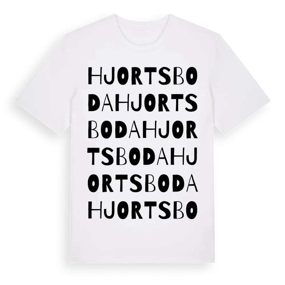 Hjortsboda ordlek t-shirt är inspirerad av byn Hjortsboda i Hallands län, Sverige. Tröjan är designad för dig som har en speciell koppling till platsen – oavsett om du bor här, har rötterna här eller bara älskar Hjortsboda.