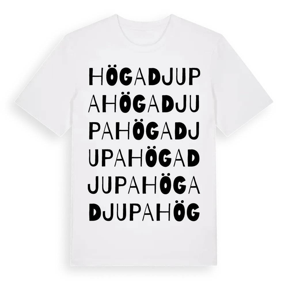 Högadjupa ordlek t-shirt är inspirerad av Högadjupa i Hallands län, Sverige. Tröjan är designad för dig som har en speciell koppling till platsen – oavsett om du bor här, har rötterna här eller bara älskar Högadjupa.