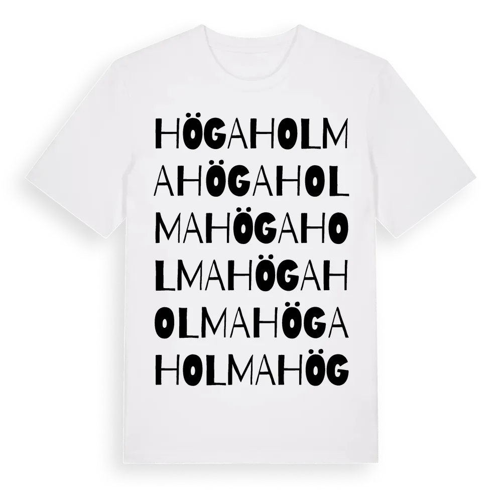 Högaholma ordlek t-shirt är inspirerad av stadsdelen Högaholma i Hallands län, Sverige. Tröjan är designad för dig som har en speciell koppling till platsen – oavsett om du bor här, har rötterna här eller bara älskar Högaholma.