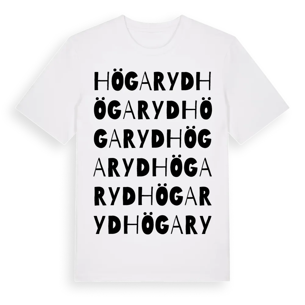 Högaryd ordlek t-shirt är inspirerad av Högaryd i Hallands län, Sverige. Tröjan är designad för dig som har en speciell koppling till platsen – oavsett om du bor här, har rötterna här eller bara älskar Högaryd.