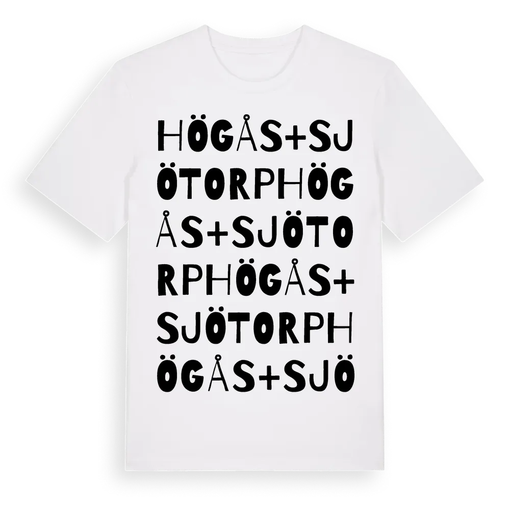 Högås + Sjötorp ordlek t-shirt är inspirerad av byn Högås + Sjötorp i Hallands län, Sverige. Tröjan är designad för dig som har en speciell koppling till platsen – oavsett om du bor här, har rötterna här eller bara älskar Högås + Sjötorp.