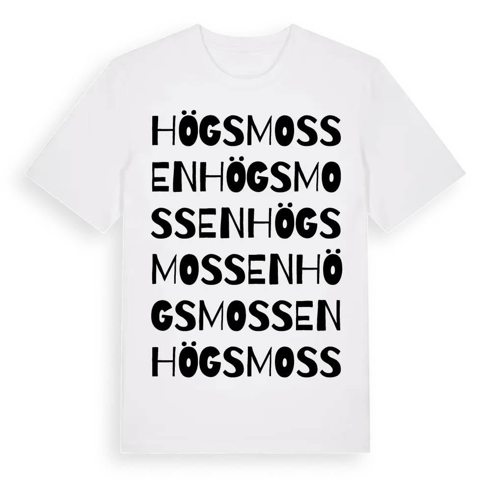 Högsmossen ordlek t-shirt är inspirerad av Högsmossen i Hallands län, Sverige. Tröjan är designad för dig som har en speciell koppling till platsen – oavsett om du bor här, har rötterna här eller bara älskar Högsmossen.