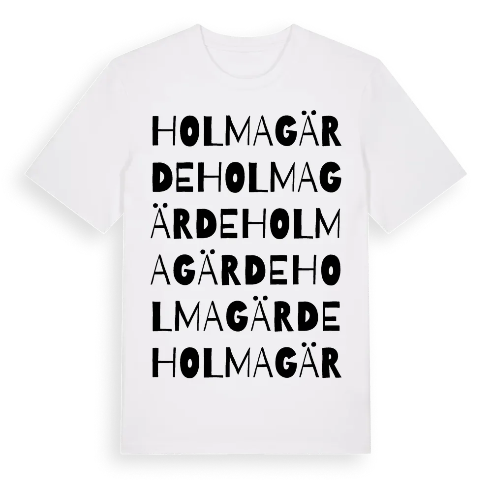 Holmagärde ordlek t-shirt är inspirerad av Holmagärde i Hallands län, Sverige. Tröjan är designad för dig som har en speciell koppling till platsen – oavsett om du bor här, har rötterna här eller bara älskar Holmagärde.