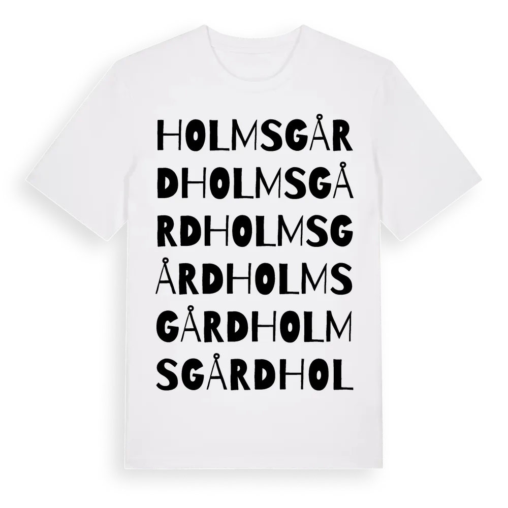 Holms Gård ordlek t-shirt är inspirerad av Holms Gård i Hallands län, Sverige. Tröjan är designad för dig som har en speciell koppling till platsen – oavsett om du bor här, har rötterna här eller bara älskar Holms Gård.