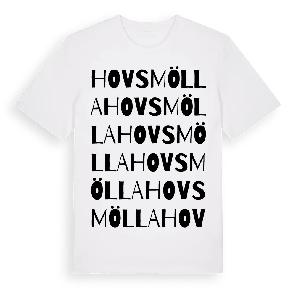 Hovsmölla ordlek t-shirt är inspirerad av Hovsmölla i Hallands län, Sverige. Tröjan är designad för dig som har en speciell koppling till platsen – oavsett om du bor här, har rötterna här eller bara älskar Hovsmölla.