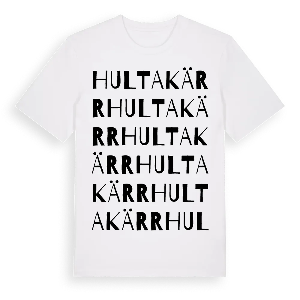 Hultakärr ordlek t-shirt är inspirerad av Hultakärr i Hallands län, Sverige. Tröjan är designad för dig som har en speciell koppling till platsen – oavsett om du bor här, har rötterna här eller bara älskar Hultakärr.