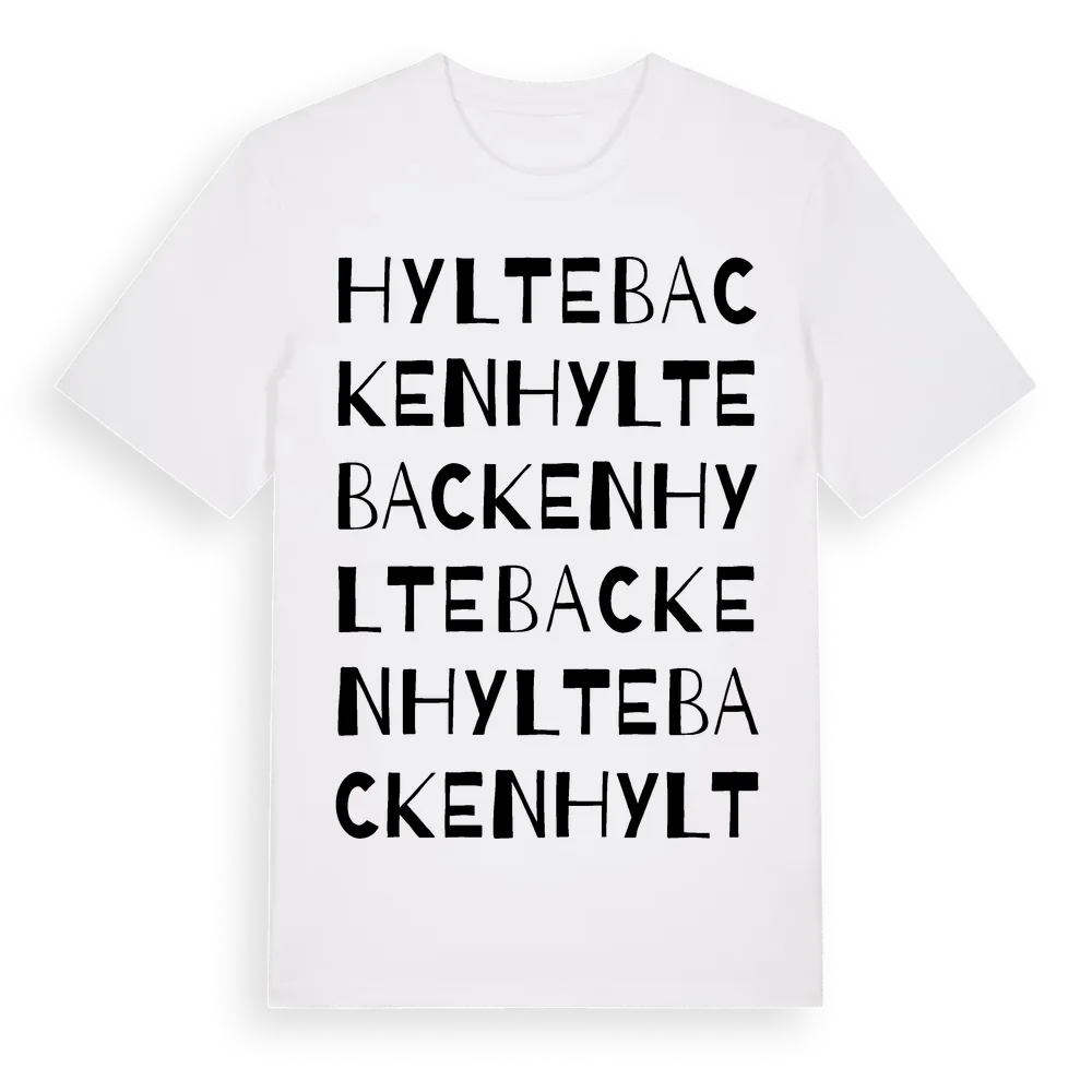 Hyltebacken ordlek t-shirt är inspirerad av Hyltebacken i Hallands län, Sverige. Tröjan är designad för dig som har en speciell koppling till platsen – oavsett om du bor här, har rötterna här eller bara älskar Hyltebacken.
