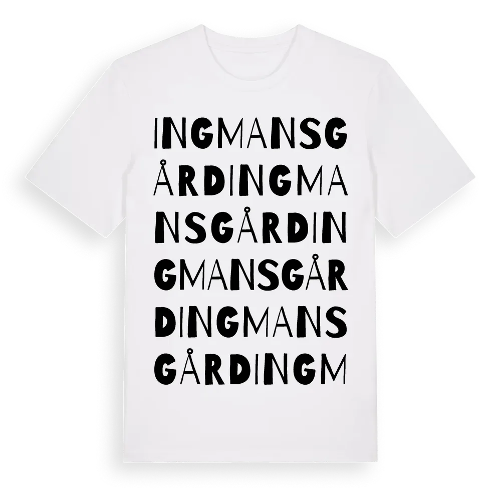 Ingmansgård ordlek t-shirt är inspirerad av Ingmansgård i Hallands län, Sverige. Tröjan är designad för dig som har en speciell koppling till platsen – oavsett om du bor här, har rötterna här eller bara älskar Ingmansgård.