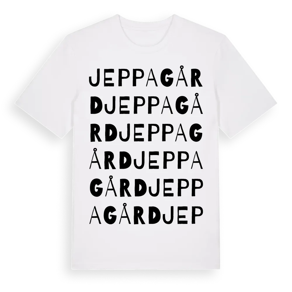Jeppagård ordlek t-shirt är inspirerad av Jeppagård i Hallands län, Sverige. Tröjan är designad för dig som har en speciell koppling till platsen – oavsett om du bor här, har rötterna här eller bara älskar Jeppagård.