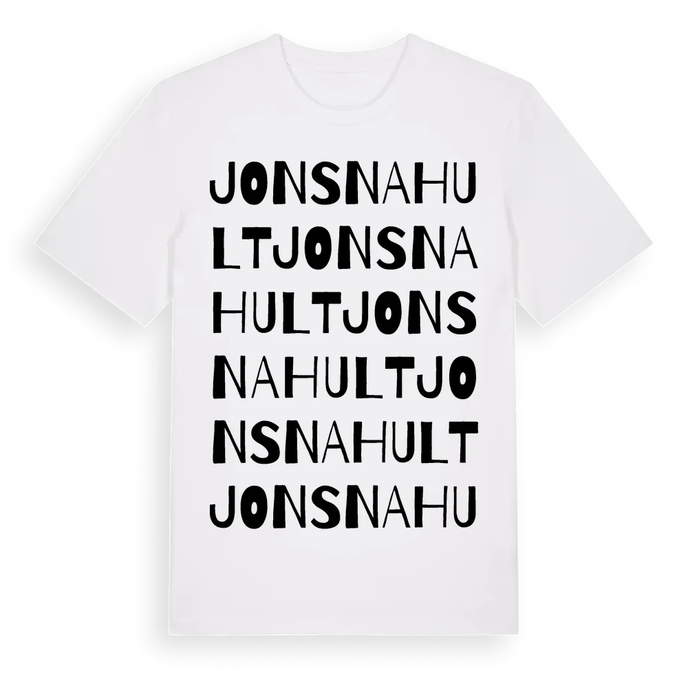 Jonsnahult ordlek t-shirt är inspirerad av Jonsnahult i Hallands län, Sverige. Tröjan är designad för dig som har en speciell koppling till platsen – oavsett om du bor här, har rötterna här eller bara älskar Jonsnahult.