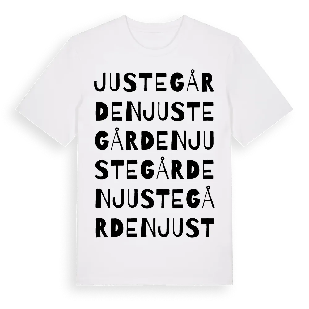 Justegården ordlek t-shirt är inspirerad av Justegården i Hallands län, Sverige. Tröjan är designad för dig som har en speciell koppling till platsen – oavsett om du bor här, har rötterna här eller bara älskar Justegården.