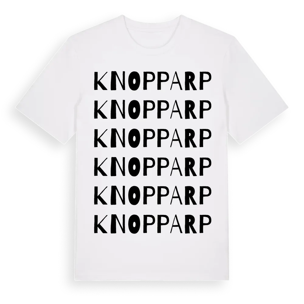 Knopparp ordlek t-shirt är inspirerad av byn Knopparp i Hallands län, Sverige. Tröjan är designad för dig som har en speciell koppling till platsen – oavsett om du bor här, har rötterna här eller bara älskar Knopparp.