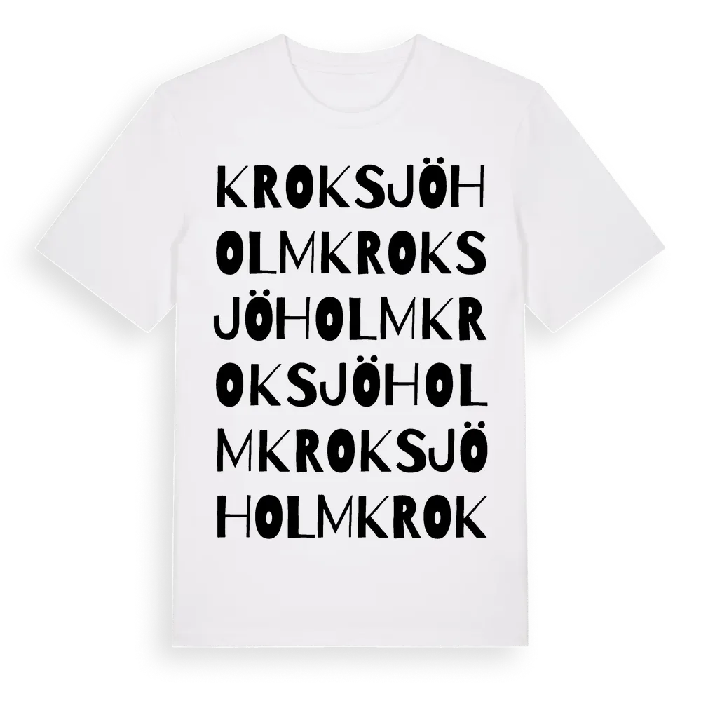 Kroksjöholm ordlek t-shirt är inspirerad av Kroksjöholm i Hallands län, Sverige. Tröjan är designad för dig som har en speciell koppling till platsen – oavsett om du bor här, har rötterna här eller bara älskar Kroksjöholm.
