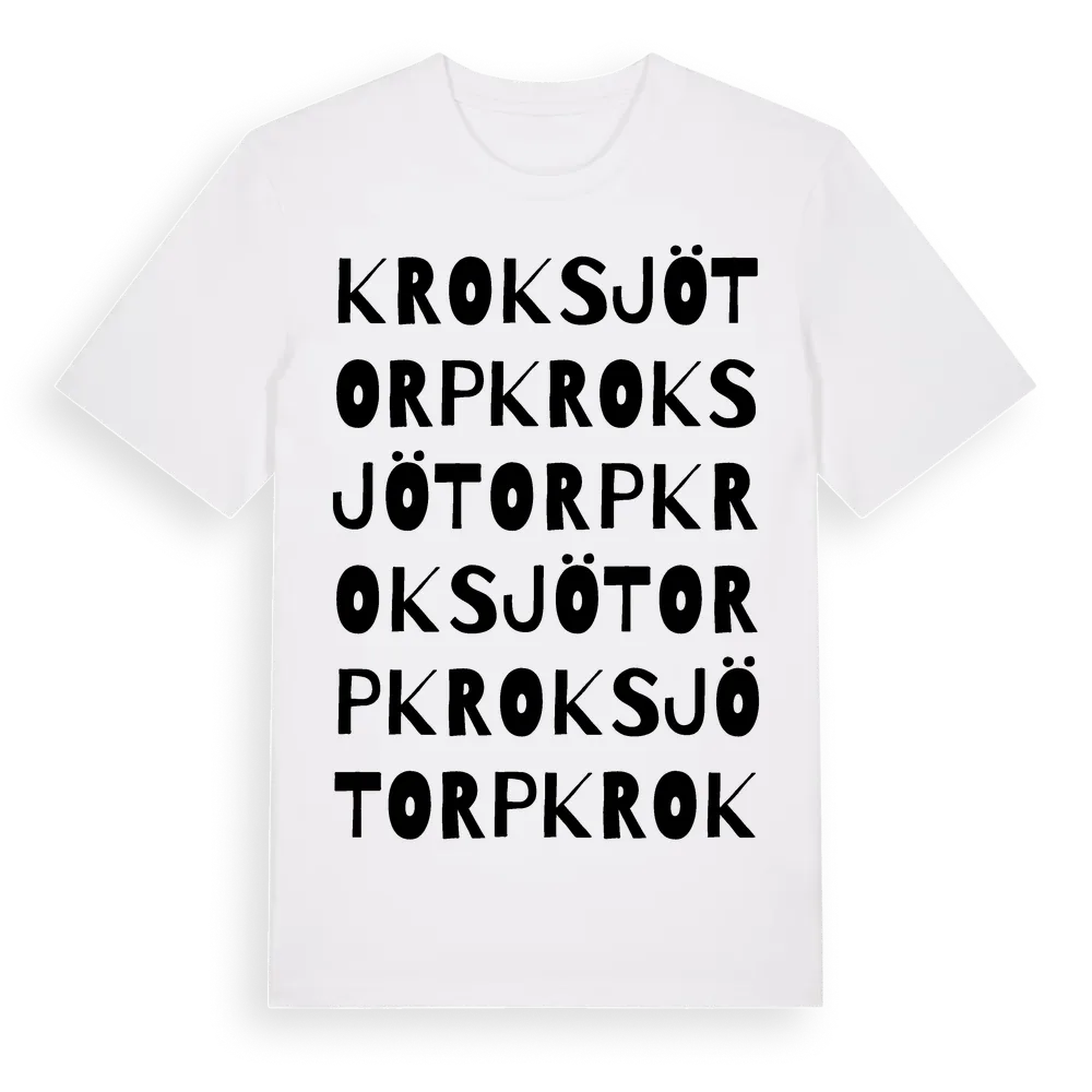 Kroksjötorp ordlek t-shirt är inspirerad av Kroksjötorp i Hallands län, Sverige. Tröjan är designad för dig som har en speciell koppling till platsen – oavsett om du bor här, har rötterna här eller bara älskar Kroksjötorp.