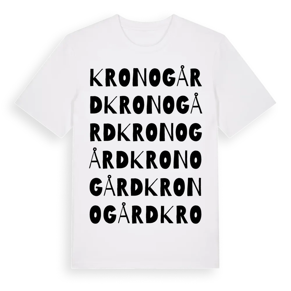 Kronogård ordlek t-shirt är inspirerad av Kronogård i Hallands län, Sverige. Tröjan är designad för dig som har en speciell koppling till platsen – oavsett om du bor här, har rötterna här eller bara älskar Kronogård.