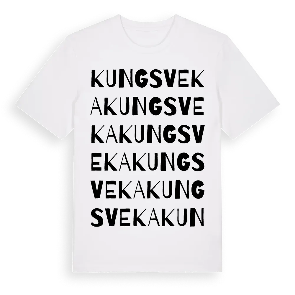 Kungsveka ordlek t-shirt är inspirerad av Kungsveka i Hallands län, Sverige. Tröjan är designad för dig som har en speciell koppling till platsen – oavsett om du bor här, har rötterna här eller bara älskar Kungsveka.