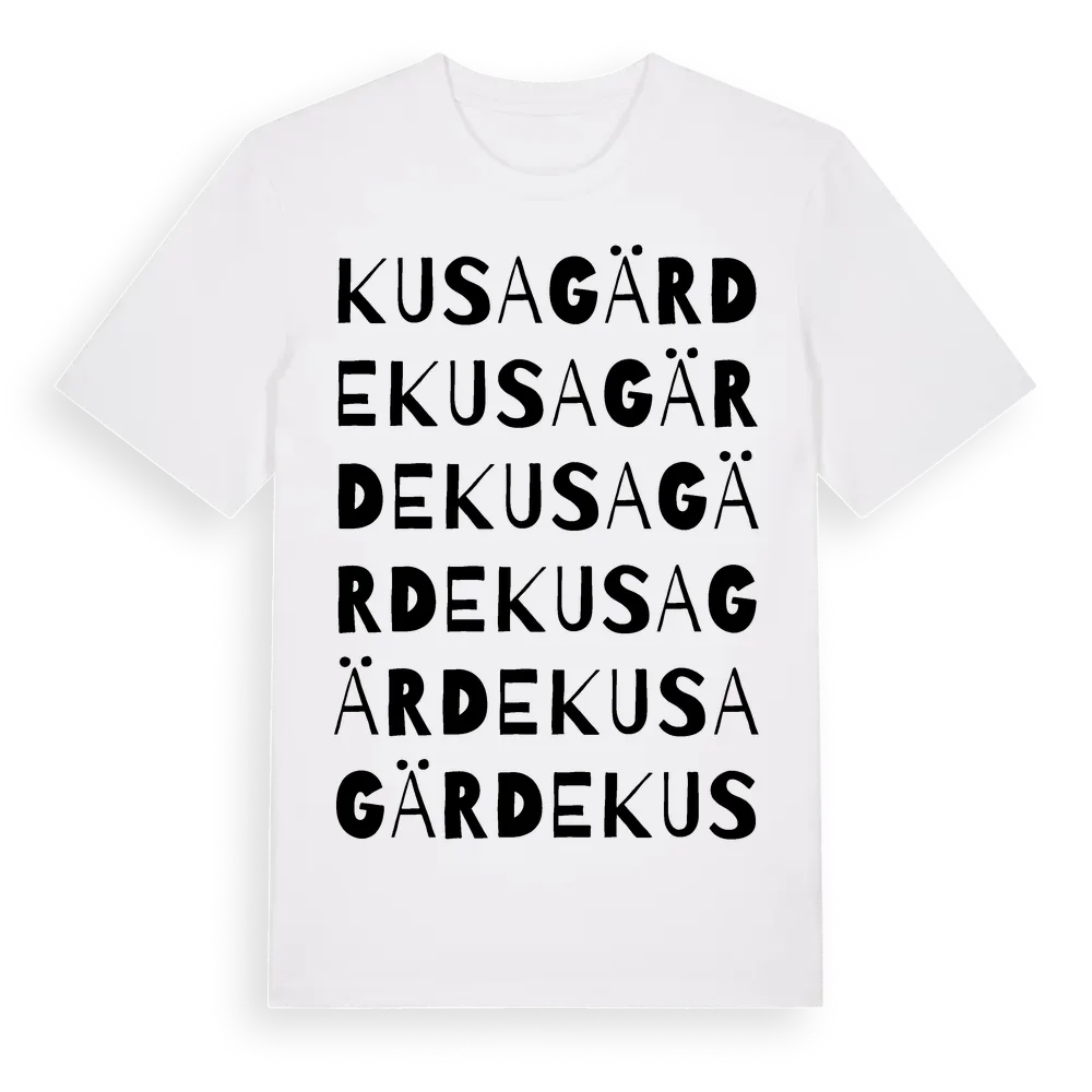 Kusagärde ordlek t-shirt är inspirerad av Kusagärde i Hallands län, Sverige. Tröjan är designad för dig som har en speciell koppling till platsen – oavsett om du bor här, har rötterna här eller bara älskar Kusagärde.
