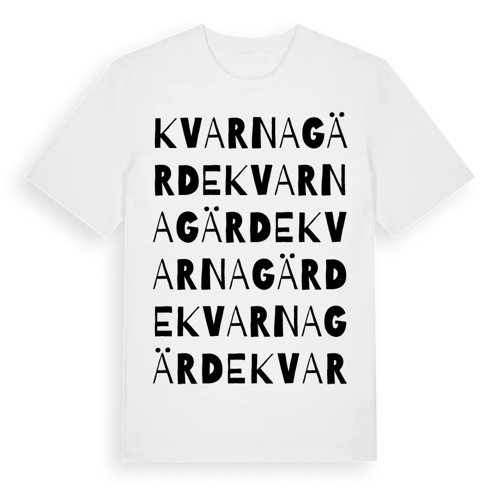 Kvarnagärde ordlek t-shirt är inspirerad av Kvarnagärde i Hallands län, Sverige. Tröjan är designad för dig som har en speciell koppling till platsen – oavsett om du bor här, har rötterna här eller bara älskar Kvarnagärde.