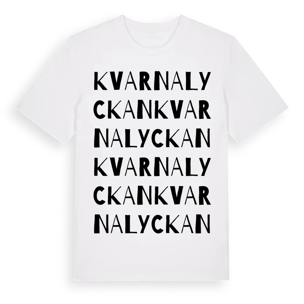 Kvarnalyckan ordlek t-shirt är inspirerad av Kvarnalyckan i Hallands län, Sverige. Tröjan är designad för dig som har en speciell koppling till platsen – oavsett om du bor här, har rötterna här eller bara älskar Kvarnalyckan.