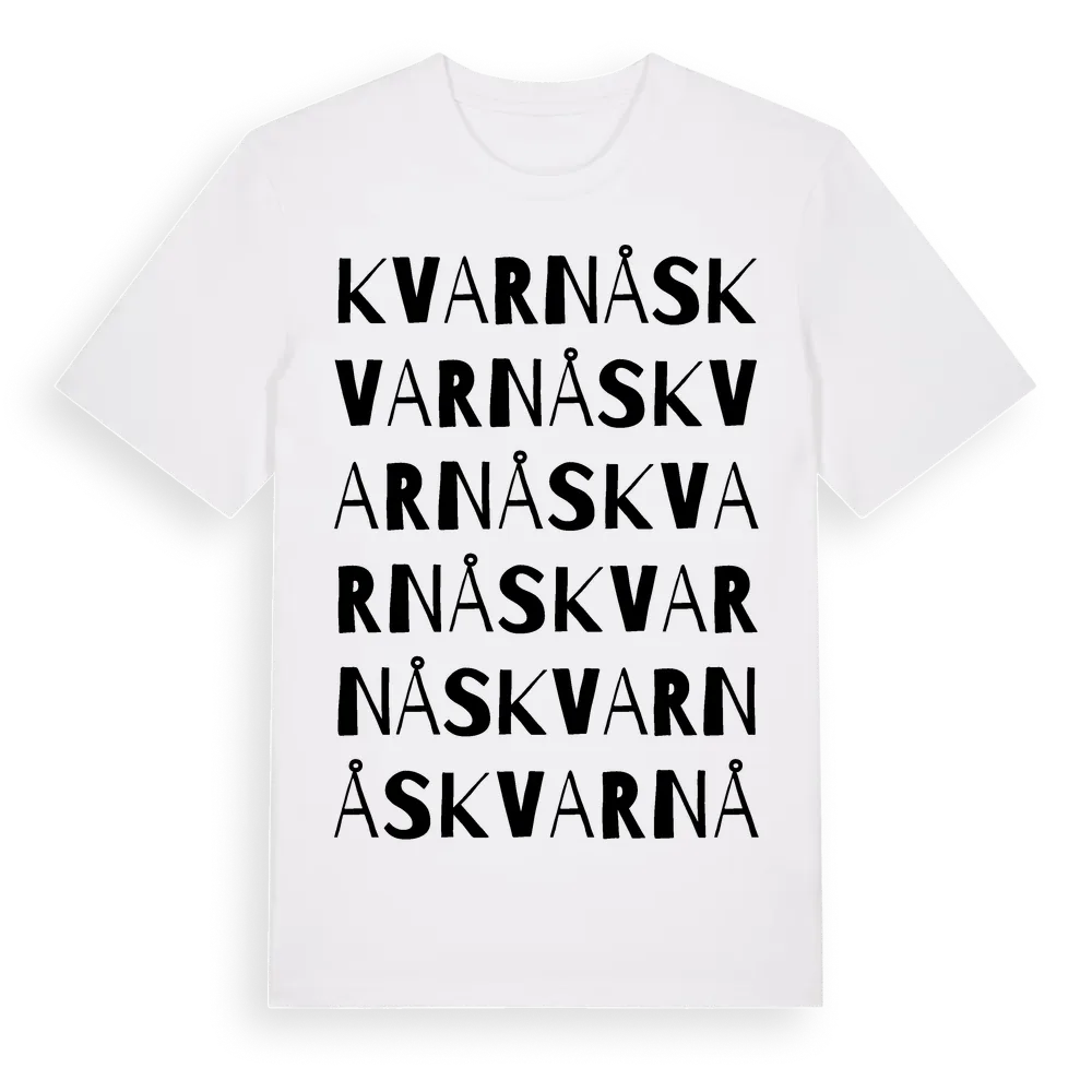 Kvarnås ordlek t-shirt är inspirerad av Kvarnås i Hallands län, Sverige. Tröjan är designad för dig som har en speciell koppling till platsen – oavsett om du bor här, har rötterna här eller bara älskar Kvarnås.