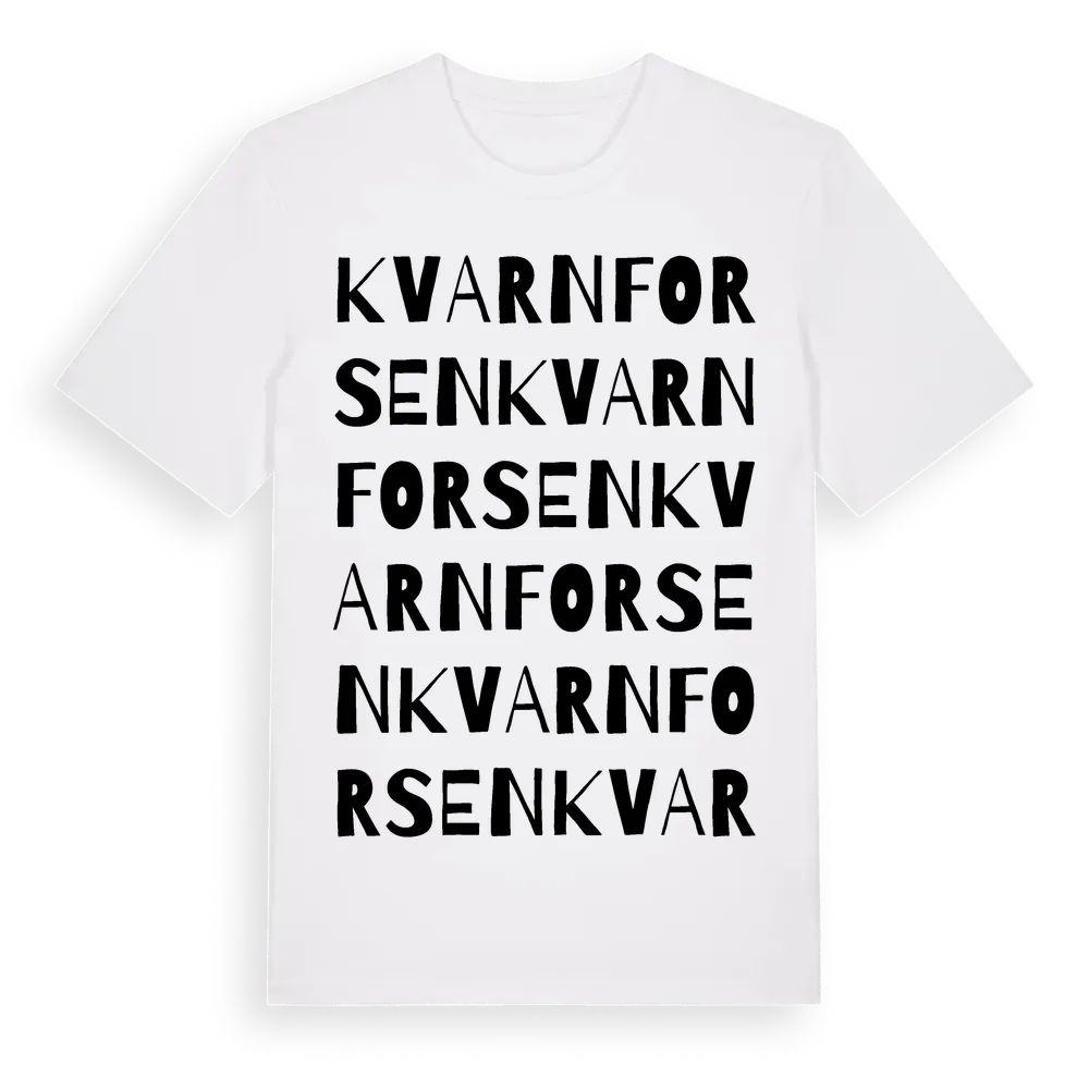 Kvarnforsen ordlek t-shirt är inspirerad av Kvarnforsen i Hallands län, Sverige. Tröjan är designad för dig som har en speciell koppling till platsen – oavsett om du bor här, har rötterna här eller bara älskar Kvarnforsen.