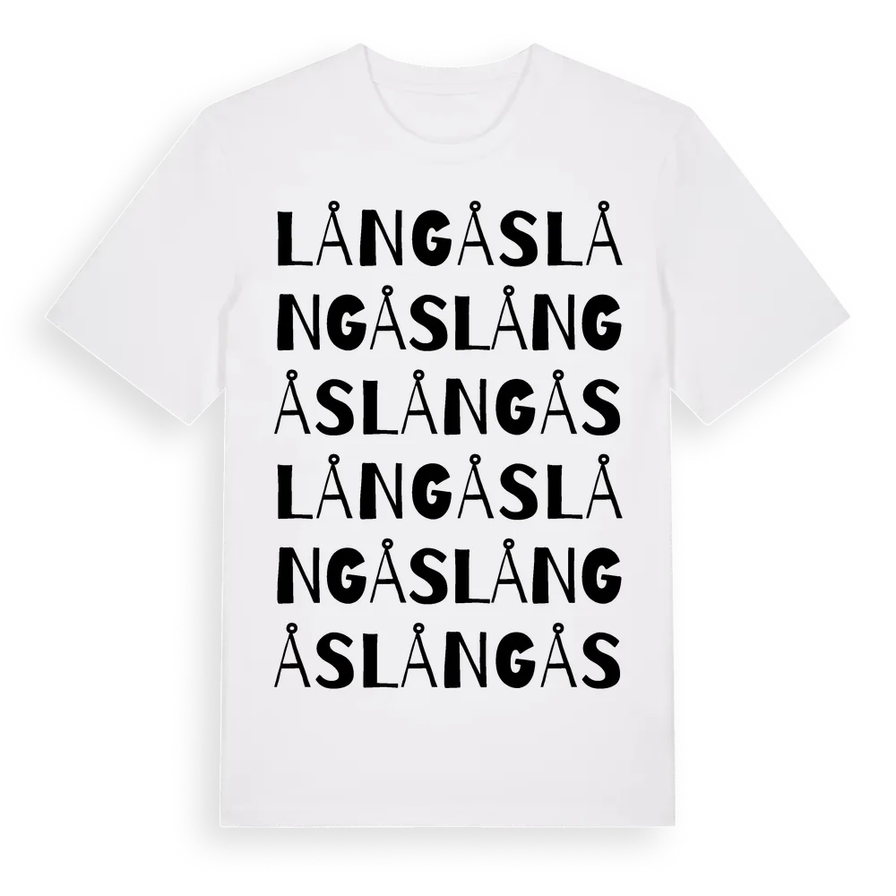 Långås ordlek t-shirt är inspirerad av Långås i Hallands län, Sverige. Tröjan är designad för dig som har en speciell koppling till platsen – oavsett om du bor här, har rötterna här eller bara älskar Långås.