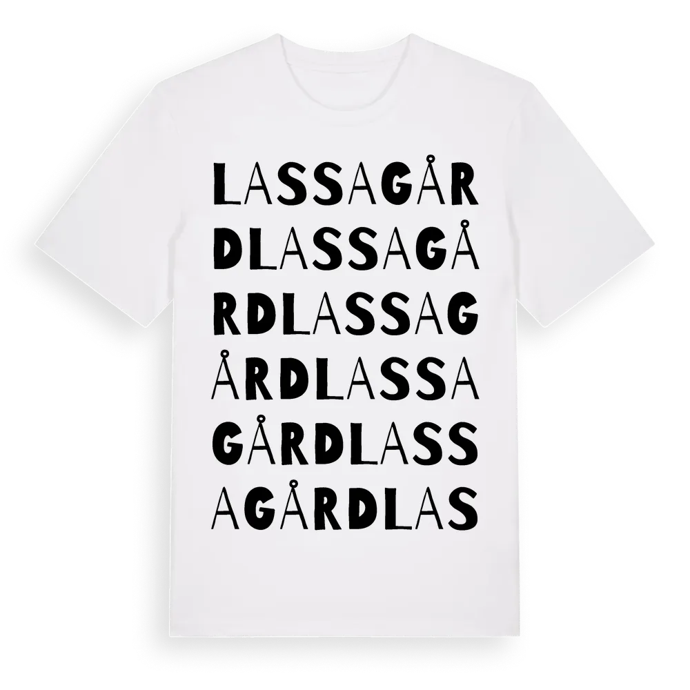 Lassagård ordlek t-shirt är inspirerad av Lassagård i Hallands län, Sverige. Tröjan är designad för dig som har en speciell koppling till platsen – oavsett om du bor här, har rötterna här eller bara älskar Lassagård.