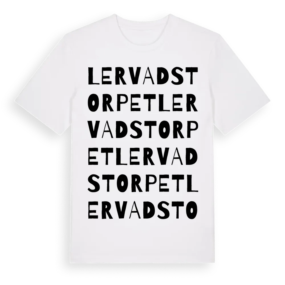 Lervadstorpet ordlek t-shirt är inspirerad av Lervadstorpet i Hallands län, Sverige. Tröjan är designad för dig som har en speciell koppling till platsen – oavsett om du bor här, har rötterna här eller bara älskar Lervadstorpet.