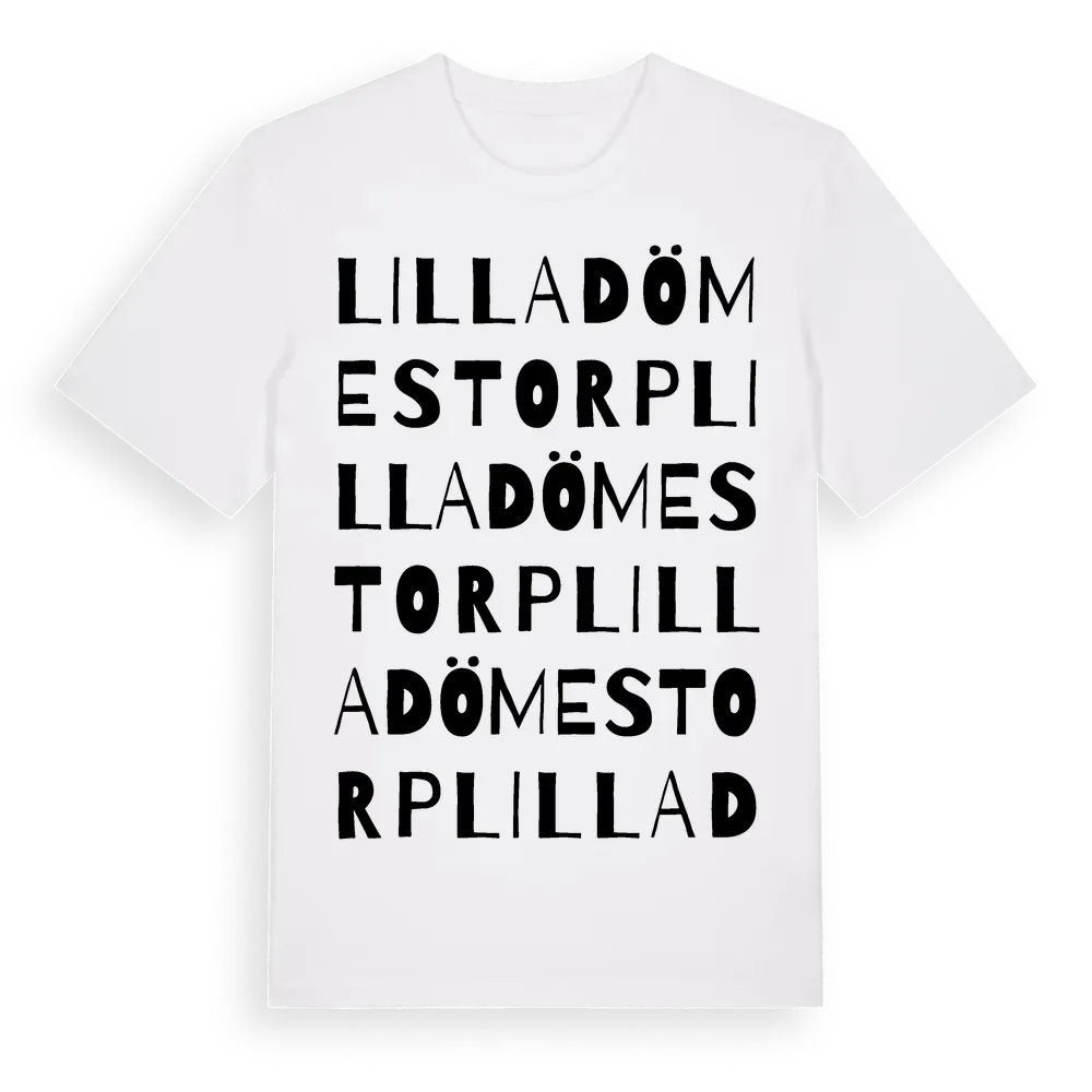 Lilla Dömestorp ordlek t-shirt är inspirerad av Lilla Dömestorp i Hallands län, Sverige. Tröjan är designad för dig som har en speciell koppling till platsen – oavsett om du bor här, har rötterna här eller bara älskar Lilla Dömestorp.