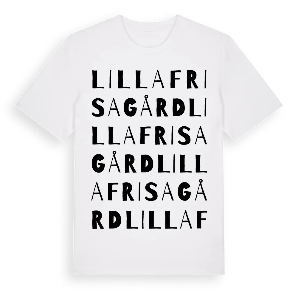 Lilla Frisagård ordlek t-shirt är inspirerad av Lilla Frisagård i Hallands län, Sverige. Tröjan är designad för dig som har en speciell koppling till platsen – oavsett om du bor här, har rötterna här eller bara älskar Lilla Frisagård.
