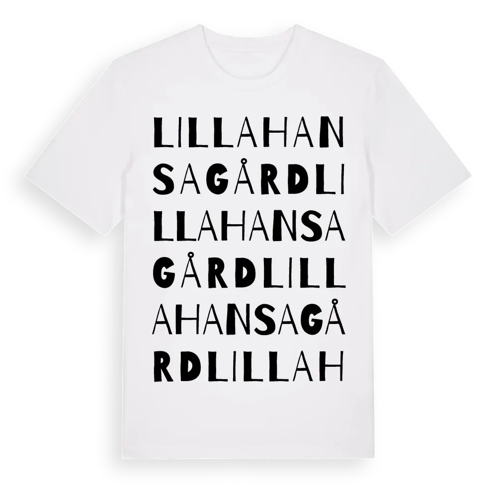 Lilla Hansagård ordlek t-shirt är inspirerad av Lilla Hansagård i Hallands län, Sverige. Tröjan är designad för dig som har en speciell koppling till platsen – oavsett om du bor här, har rötterna här eller bara älskar Lilla Hansagård.