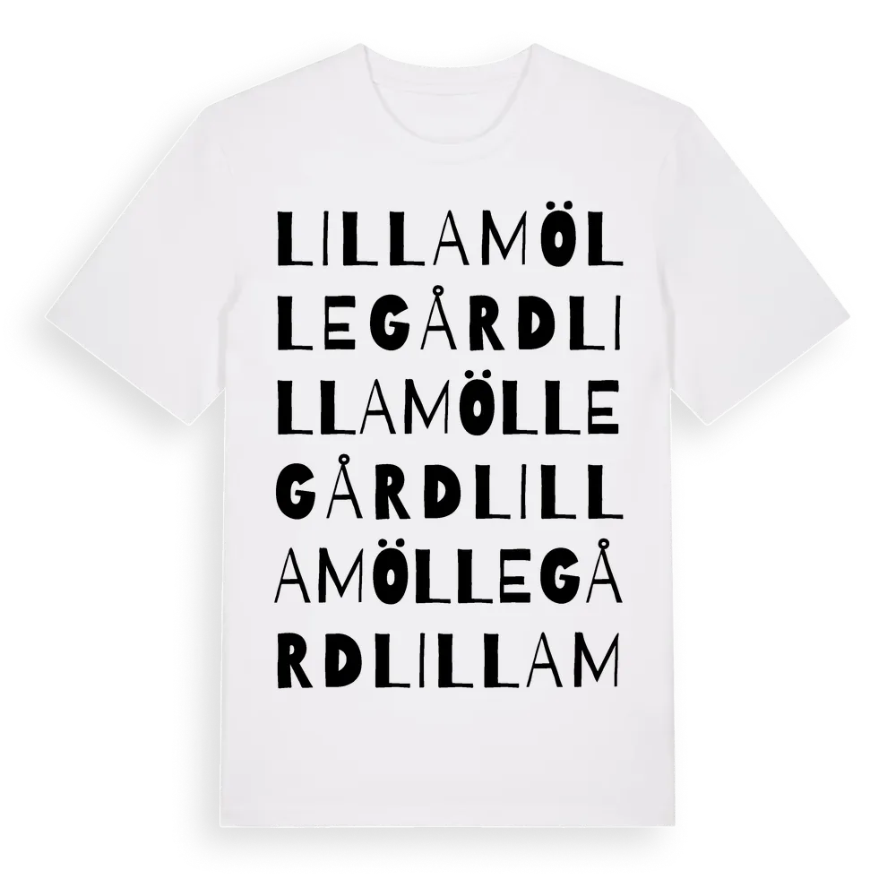 Lilla Möllegård ordlek t-shirt är inspirerad av Lilla Möllegård i Hallands län, Sverige. Tröjan är designad för dig som har en speciell koppling till platsen – oavsett om du bor här, har rötterna här eller bara älskar Lilla Möllegård.
