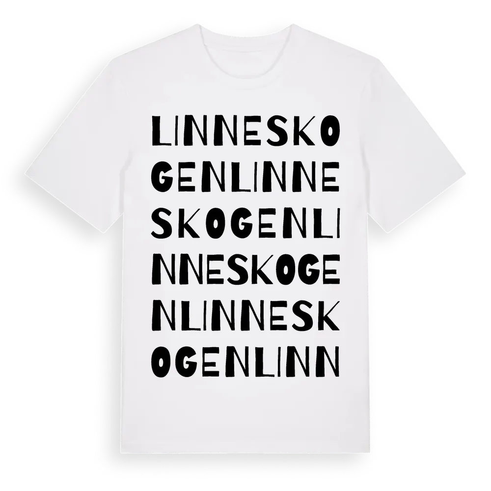 Linneskogen ordlek t-shirt är inspirerad av Linneskogen i Hallands län, Sverige. Tröjan är designad för dig som har en speciell koppling till platsen – oavsett om du bor här, har rötterna här eller bara älskar Linneskogen.
