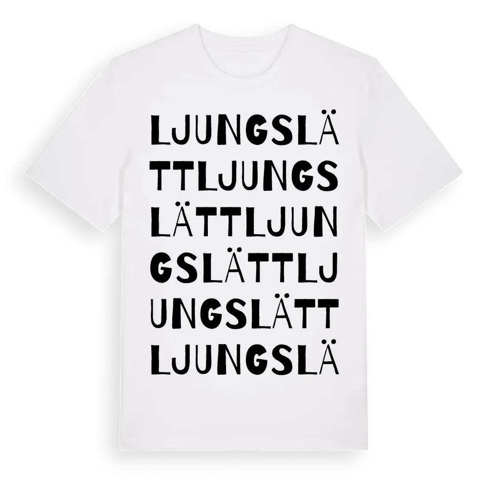 Ljungslätt ordlek t-shirt är inspirerad av Ljungslätt i Hallands län, Sverige. Tröjan är designad för dig som har en speciell koppling till platsen – oavsett om du bor här, har rötterna här eller bara älskar Ljungslätt.