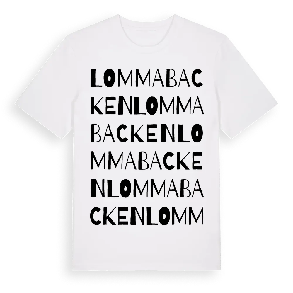 Lommabacken ordlek t-shirt är inspirerad av Lommabacken i Hallands län, Sverige. Tröjan är designad för dig som har en speciell koppling till platsen – oavsett om du bor här, har rötterna här eller bara älskar Lommabacken.