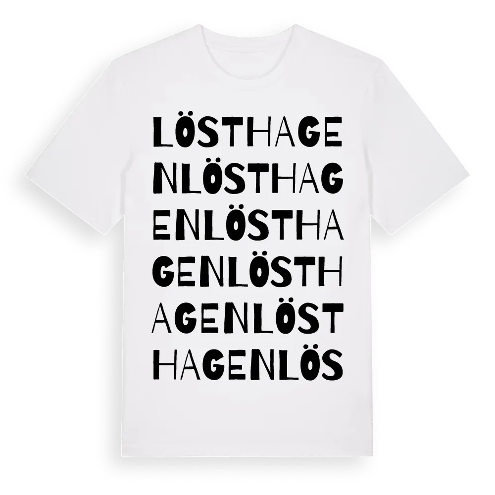 Lösthagen ordlek t-shirt är inspirerad av Lösthagen i Hallands län, Sverige. Tröjan är designad för dig som har en speciell koppling till platsen – oavsett om du bor här, har rötterna här eller bara älskar Lösthagen.
