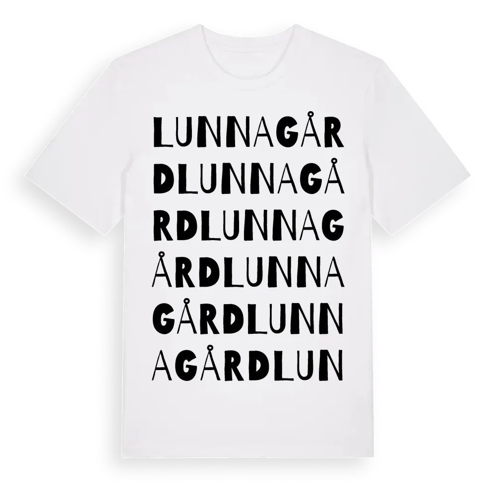 Lunnagård ordlek t-shirt är inspirerad av Lunnagård i Hallands län, Sverige. Tröjan är designad för dig som har en speciell koppling till platsen – oavsett om du bor här, har rötterna här eller bara älskar Lunnagård.