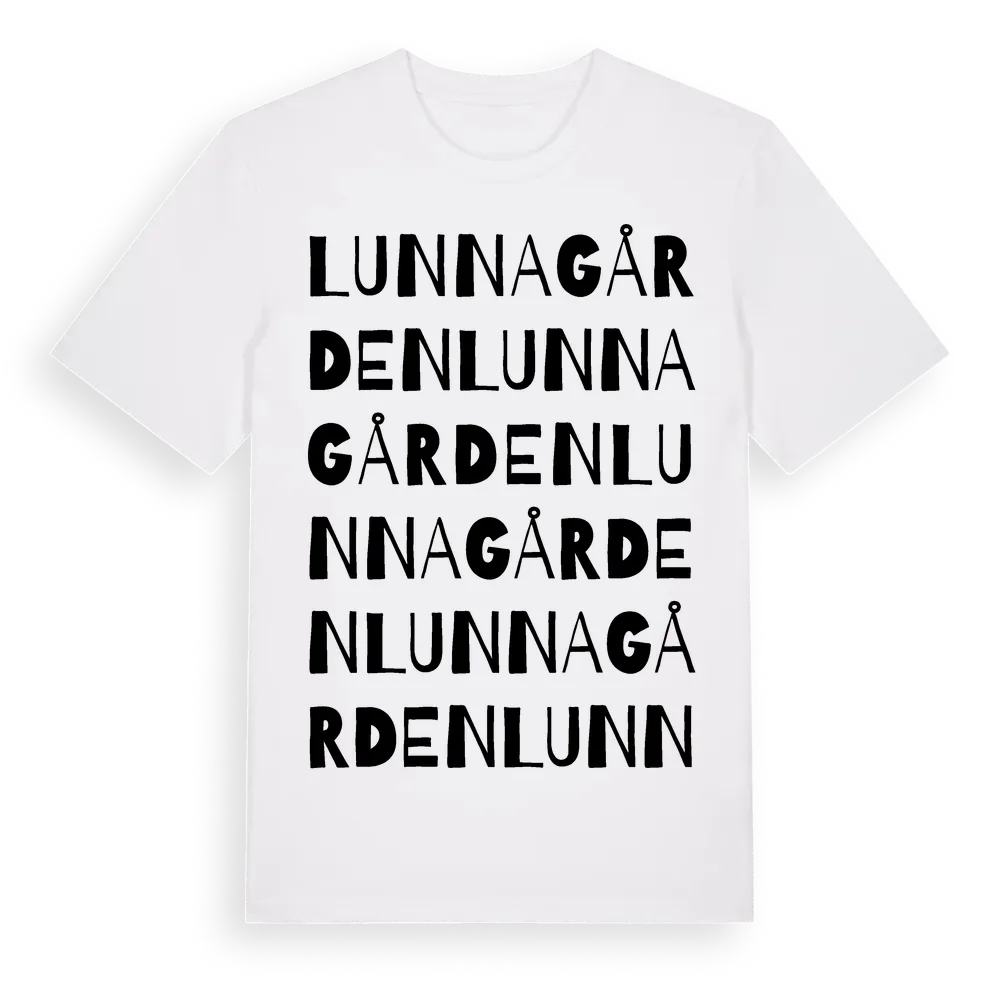 Lunnagården ordlek t-shirt är inspirerad av Lunnagården i Hallands län, Sverige. Tröjan är designad för dig som har en speciell koppling till platsen – oavsett om du bor här, har rötterna här eller bara älskar Lunnagården.